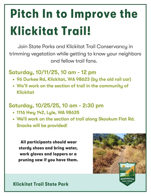 In early October, a Washington Department of Transportation contractor will be paving the Klickitat Trail through a major section of the Klickitat community. The objective is to facilitate local kids walking and biking safely to and from school using the Klickitat Trail.